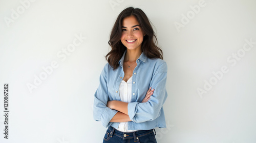 Woman with brown hair with arms crossed and a friendly smile on her face