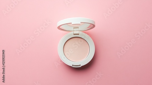 Open face powder compact on pink background