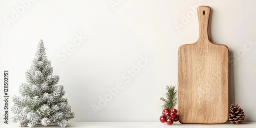 Wooden cutting board positioned vertically on the right side next to a snowy Christmas tree on the left against a bright white wall background