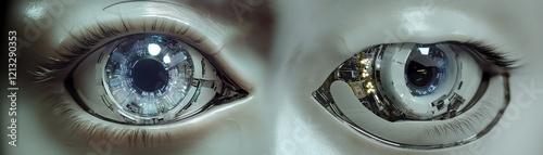 An ultra-realistic cybernetic eye, the iris surrounded by delicate LED circuits, pulsating with life-like precision and technology
