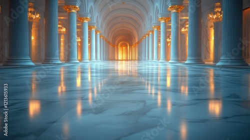 Grand Palace Hallway, Marble Floor, Golden Light, Columns, Architecture