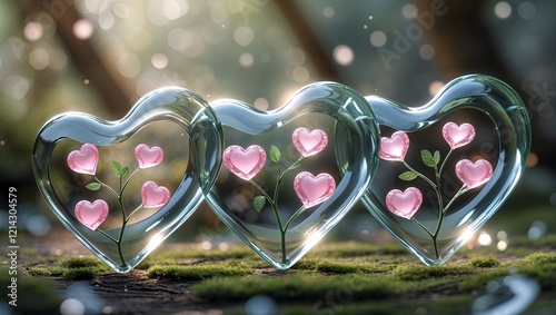 Beautiful Pink Blooms in Trio of Glass Heart Sculptures.Glossy pink heart shape on a soft Gradient,Symbolizing love and affection in a modern.Very most of the popular art,celevration for valantine day