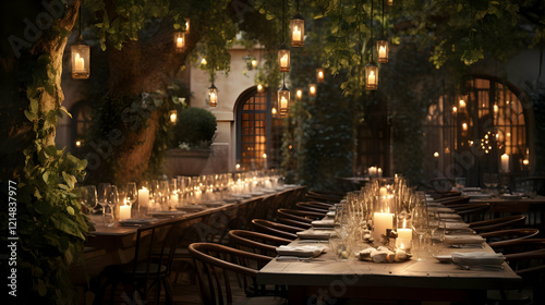 Enchanting Outdoor Dining Venue Decorated with Hanging Lanterns and Candles Creates a Magical Ambiance