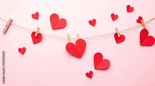 Valentine's day background, red paper hearts, string lights, pink surface, romantic setting, craft decorations, love theme, minimalist design, clean aesthetic, soft lighting, delicate arrangement, hol