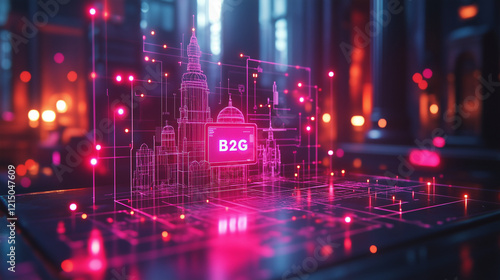 "B2G" with sleek icons of connected e-government structures on a muted gradient. Bright lighting, contrast