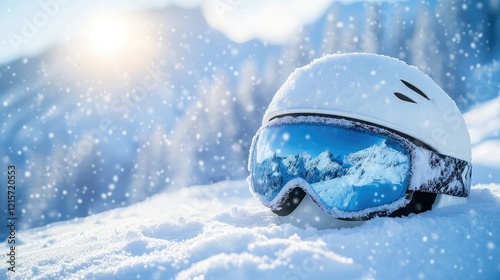 Close Up of White Ski Helmet and Goggles on Snowy Landscape with Soft Focus and Sunlight for Text Space in Winter Sports Theme