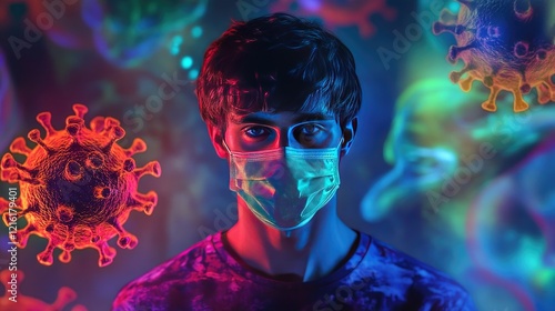 A serious young man in a face mask with stylized virus graphics swirling in the background.