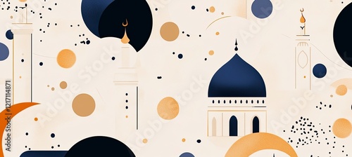 Simple vector design, a flat illustration of an Islamic pattern background with a mosque silhouette and ornamental decoration.