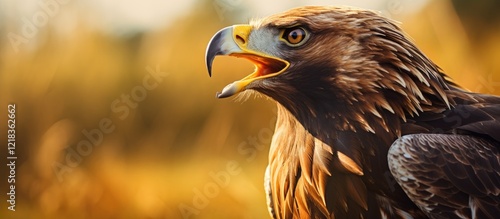 Majestic Golden Eagle Aquila chrysaetos with open beak in dynamic pose showcasing feather details against a blurred golden background.