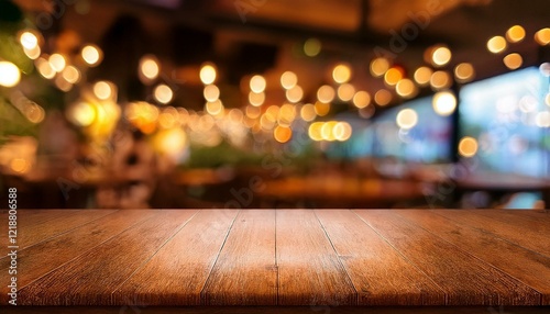 an empty beautiful wooden tabletop with a blurred bokeh background of a restaurant interior ideal for product display and key visual design concepts perfect for restaurant marketing