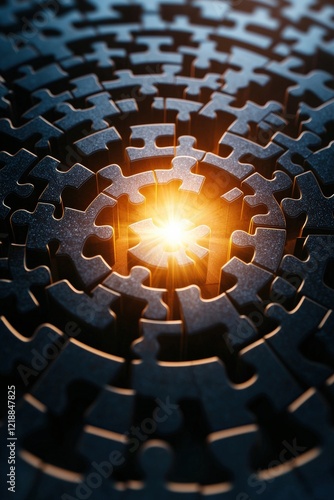 Maze intertwined with radiant puzzle pieces guiding toward a center light