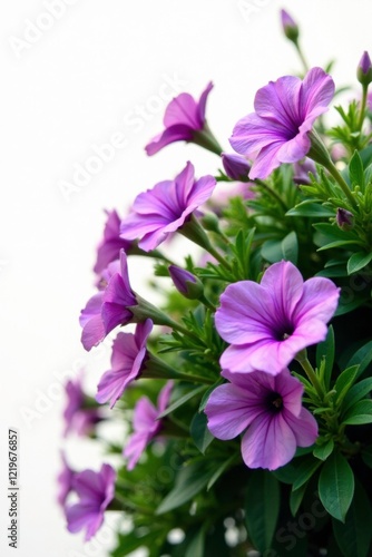 Colorful purple flowers blooming on a shrubbery isolated against white background, botanical garden, garden