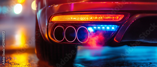 Rauchende Auspuffrohre eines Sportwagens in neonfarbiger Beleuchtung