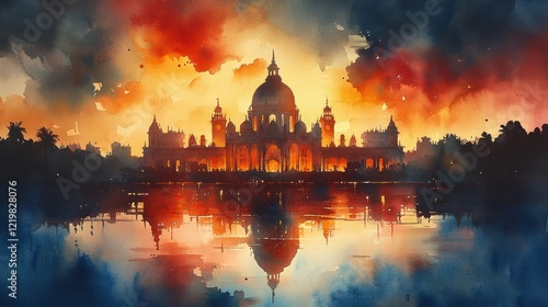 #1219828076silhouette of an indian temple against a breathtaking sunset sky rich with warm hues providing an evocative backdrop for spiritual themes and empty text space