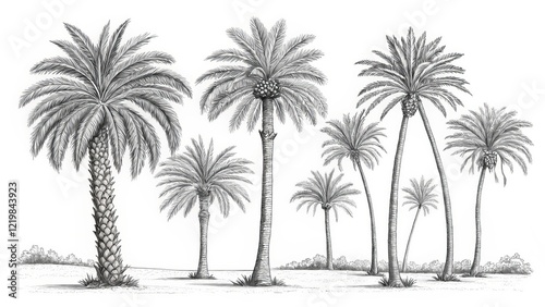 Pen and Ink Palm Tree Grove Detailed Botanical Illustration, Black and White, Tropical Landscape, Palm Trees, Oasis Palm Trees, Botanical Illustration