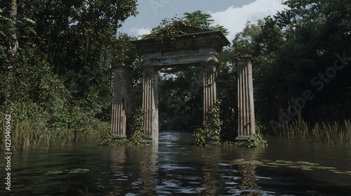 A weathered stone archway stands in a waterlogged forest overtaken by nature