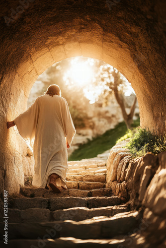 Jesus Christ standing at the entrance to the tomb. AI generative.