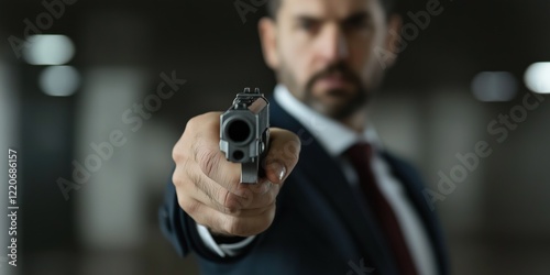 A man in a suit holding a gun. The man is wearing a tie and is looking at the camera