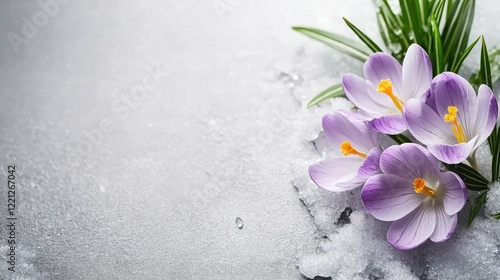 Vibrant purple crocus flowers bravely push through the glistening snow, heralding the arrival of spring on a tranquil winter morning in a pristine, untouched landscape