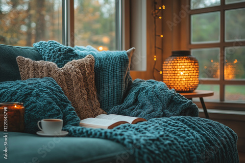 Photo d'un coin lecture cosy avec plaid, livre ouvert et source de lumière, ambiance cocooning hivernale et chaleureuse
