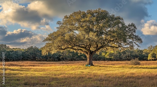 Majestic oak, golden field, sunset sky, peaceful pasture, nature scene