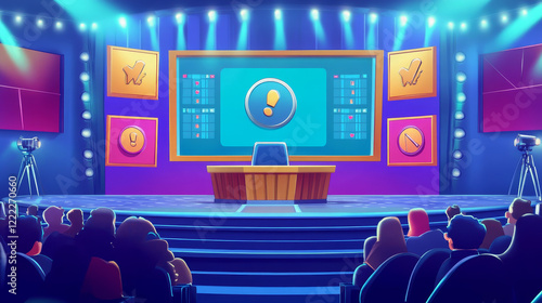 Quiz game show with question option cartoon background. Tv contest stage with screen. Television program to guess right answer on podium with tribune and spotlight. Front view entertainment broadcast.