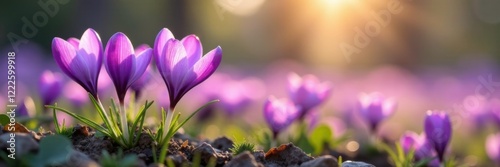 Purple crocus flowers swaying in a gentle wind, landscape, floral, wind