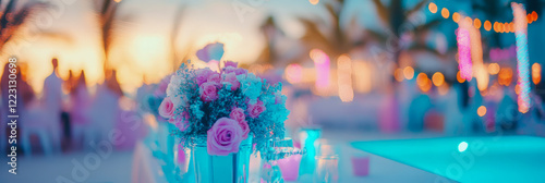 Romantic Beach Wedding Reception at Sunset: Floral Centerpiece and Festive Ambiance