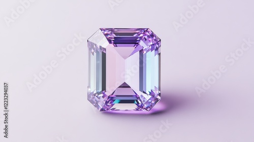 Purple Gemstone Elegance: A captivating emerald cut gemstone, glistening with iridescent hues of purple and pink, rests on a soft lilac background. Its intricate facets reflect the light.
