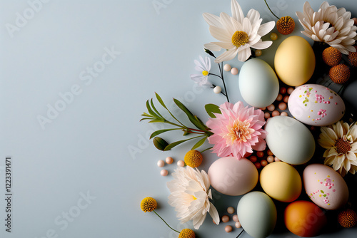 Pastelowe Jajka Wielkanocne z Kwiatowymi Akcentami na Niebieskim