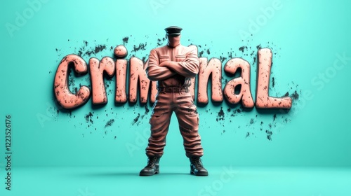 Faceless Figure in Uniform Stands Before Criminal Text