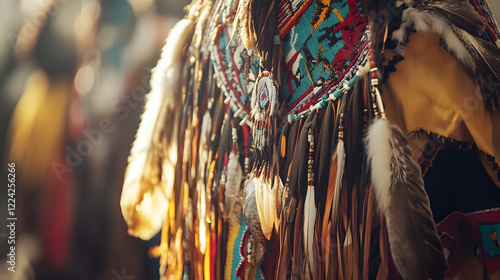 Traditional Native American Regalia with Colorful Beadwork and Feather Details : Generative AI