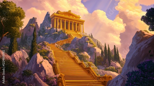 Opulent mount olympus with casino themes featuring a heavenly temple and golden stairs