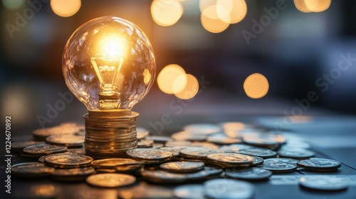 Illuminated light bulb on stacked coins symbolizing innovative financial growth