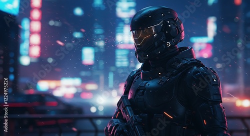 A futuristic soldier in a black power armor stands in a brightly lit city at night.