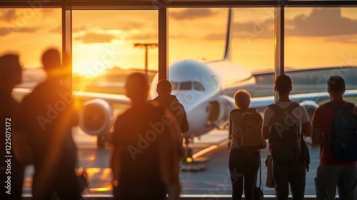 A line of travelers queuing at the boarding gate, a mix of solo backpackers, elderly couples, and business professionals with briefcases, some glancing at their boarding passes while others chat