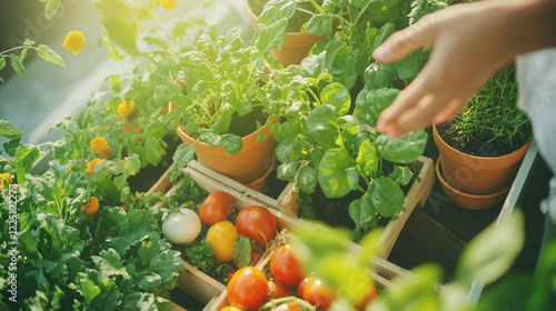 A vegetable garden on the balcony, beds made of eco-friendly materials with growing local vegetables, greens, berries, cozy and healthy corner in the house