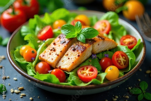 Grilled fish fillets atop fresh green salad with colorful cherry tomatoes and basil