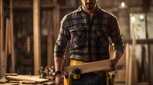 Portrait of a carpenter wearing a flannel shirt and toolbelt, holding a wooden plank, standing confidently in a woodworking shop