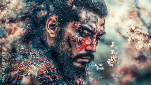 Samurai warrior, pensive, cherry blossoms, battle aftermath, film poster