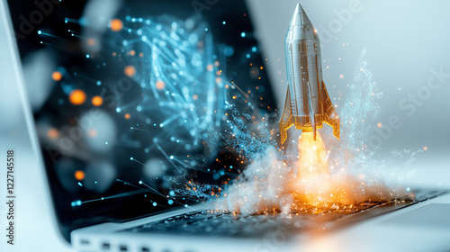 ノートパソコンから飛び立つデジタルロケット|ビジネス成長とテクノロジーの革新を象徴するコンセプトアート
