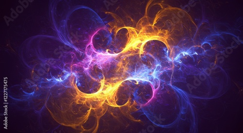 Cosmic Dance: A vibrant abstract fractal artwork featuring intertwining swirls of blue, purple, and orange, evoking a sense of movement, energy, and cosmic wonder.