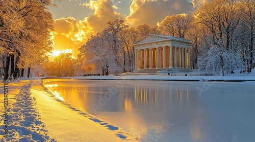 Winter Sunset at a Grecian Temple by a Frozen Lake