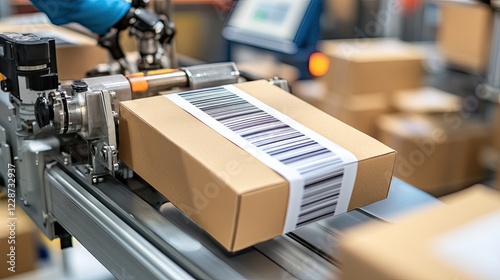 A close-up of an automated industrial labeling machine printing barcodes onto packages
