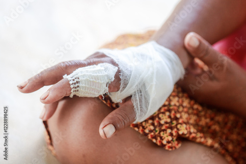 Hand of woman injured and bandaged
