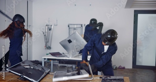 Demolition, weapon and people in rage room for anger management, cathartic therapy and stress relief. Bat, safety gear and golf club with people in smash center with emotion, break and vandalism