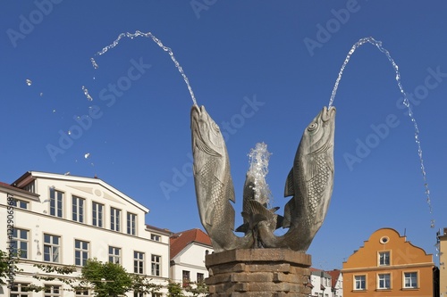 Fish fountain spouting water, Barth, Mecklenburg-Western Pomerania, Germany, Europe