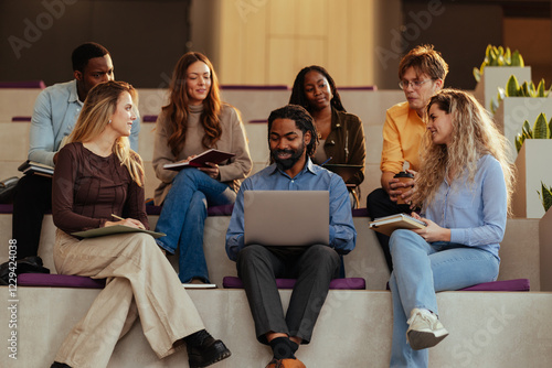 University students collaborating on project using laptop and notebooks