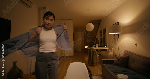 A woman puts on headphones and starts a video chat on a laptop sitting at a table in the dim light at home