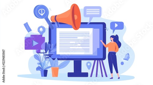 A public relations specialist crafting a press release at a desk, with communication tools and a white background.
